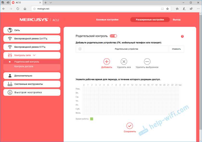 Родительский контроль. Если необходимо, можно настроить родительский контроль. Добавить устройство и задать время, когда это устройство сможет получать доступ к интернету.