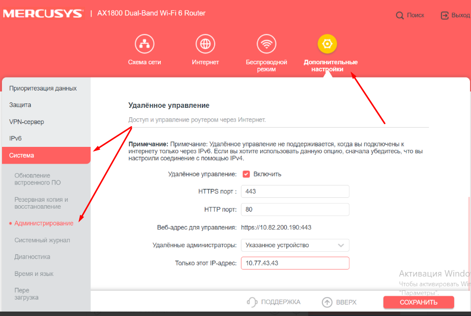 HTTPS порт устанавливаем 443, HTTP порт устанавливаем 80, в поле «Удаленные администраторы» выбираем «Указанное устройство». В поле «только этот Ip»указываем ip — 10.77.43.43 и нажимаем кнопку «Сохранить».