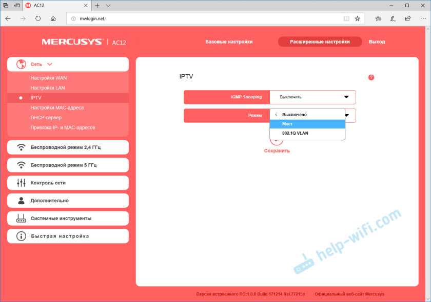 Настройки IPTV. Можно выбрать режим «Мост» и подключить IPTV приставку в выбранный LAN порт, или включить 802.11Q VLAN.