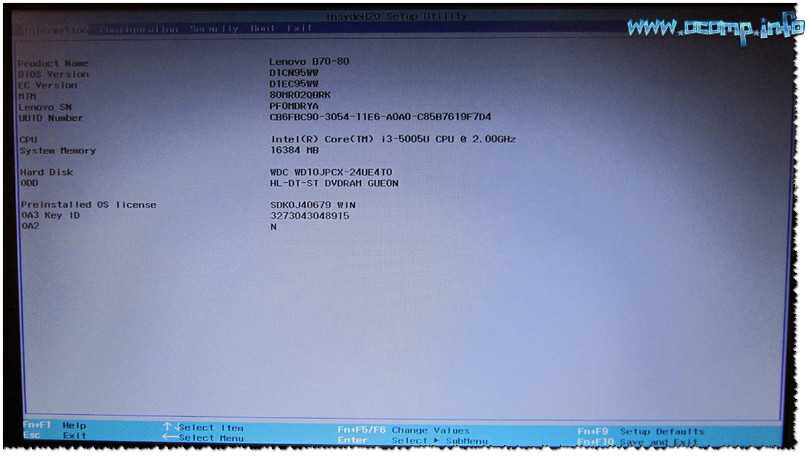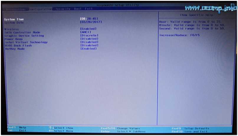 Основная вкладка в BIOS ноутбука которую вы видите, когда заходите. Позволяет получить основные сведения о ноутбуке: