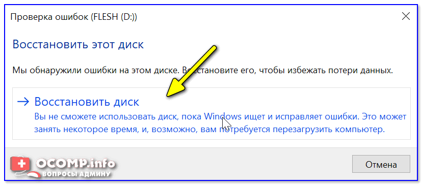 далее Windows сообщит вам о том, найдены ли были ошибки на накопителе. В моем случае: у проблемной флешки, разумеется, они были найдены — поэтому следует нажать на «Восстановить диск» ();