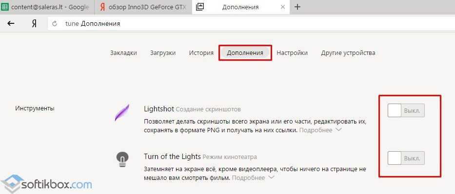 - Отключить расширения — в первую очередь блокировщики рекламы. Если проблема не в них, стоит деактивировать все дополнения по очереди.