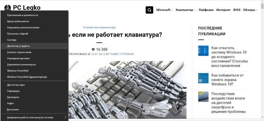 Кликнув правой кнопкой мыши на меню пуск, нужно открыть диспетчер устройств, найти там действующий драйвер клавиатуры и удалить его.