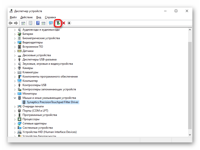 Итак, теперь выделите строку с тачпадом и на панели инструментов нажмите иконку обновления драйвера.
