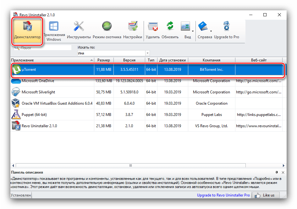 МюТоррент – программа достаточно популярная, поэтому обновления для неё выходят часто. К сожалению, разработчики не всегда успевают качественно протестировать продукт, отчего и возможно появление тех или иных багов, в том числе и рассматриваемый нами случай. Если решить проблему не помог ни один из вышеприведённых методов, вероятнее всего, вы столкнулись именно с такой ошибкой. Единственный путь, который гарантированно поможет – удаление текущей и установка предыдущей стабильной версии. Первым делом удалите основное приложение, делать это желательно посредством стороннего деинсталлятора вроде Revo Uninstaller, для стирания всех следов в файловой системе и реестре.
