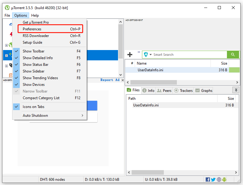 Step 1. In the main interface of uTorrent, select Options > Preferences from the upper left corner.