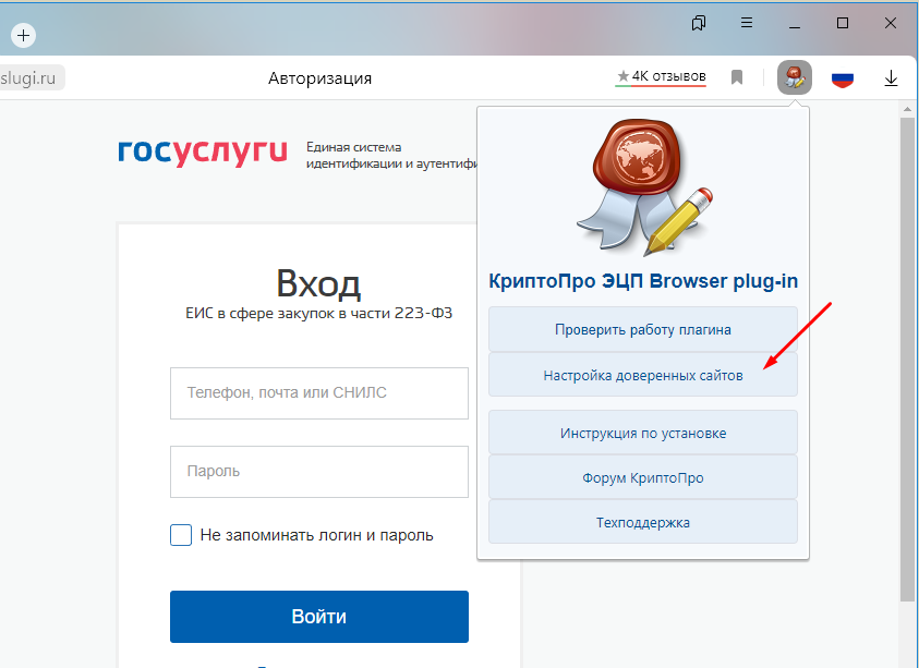 Настройка рабочего места ЕИС Закупки Яндекс браузер