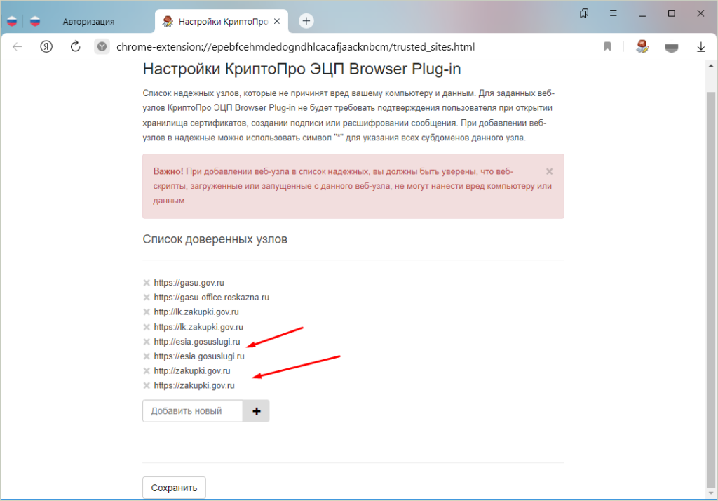 Первым делом нужно проверить список доверенных узлов, для этого кликаем на значке расширения «КриптоПро ЭЦП …» и выбираем пункт «Настройка доверенных сайтов».