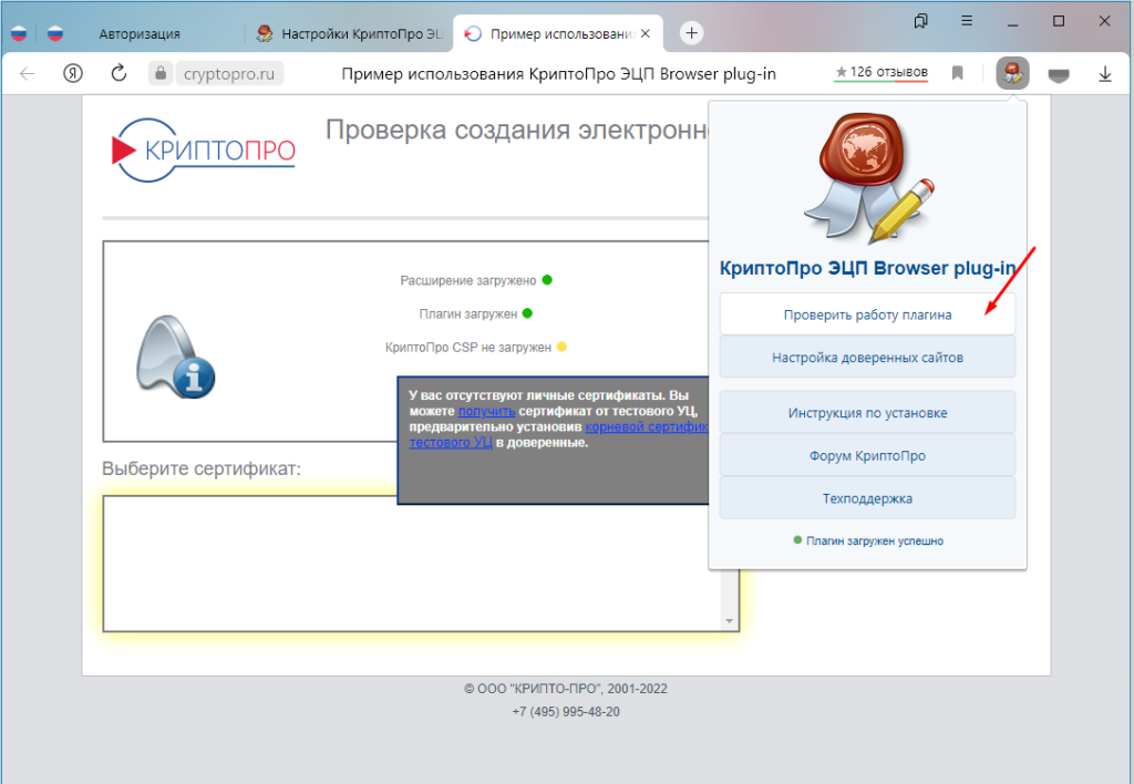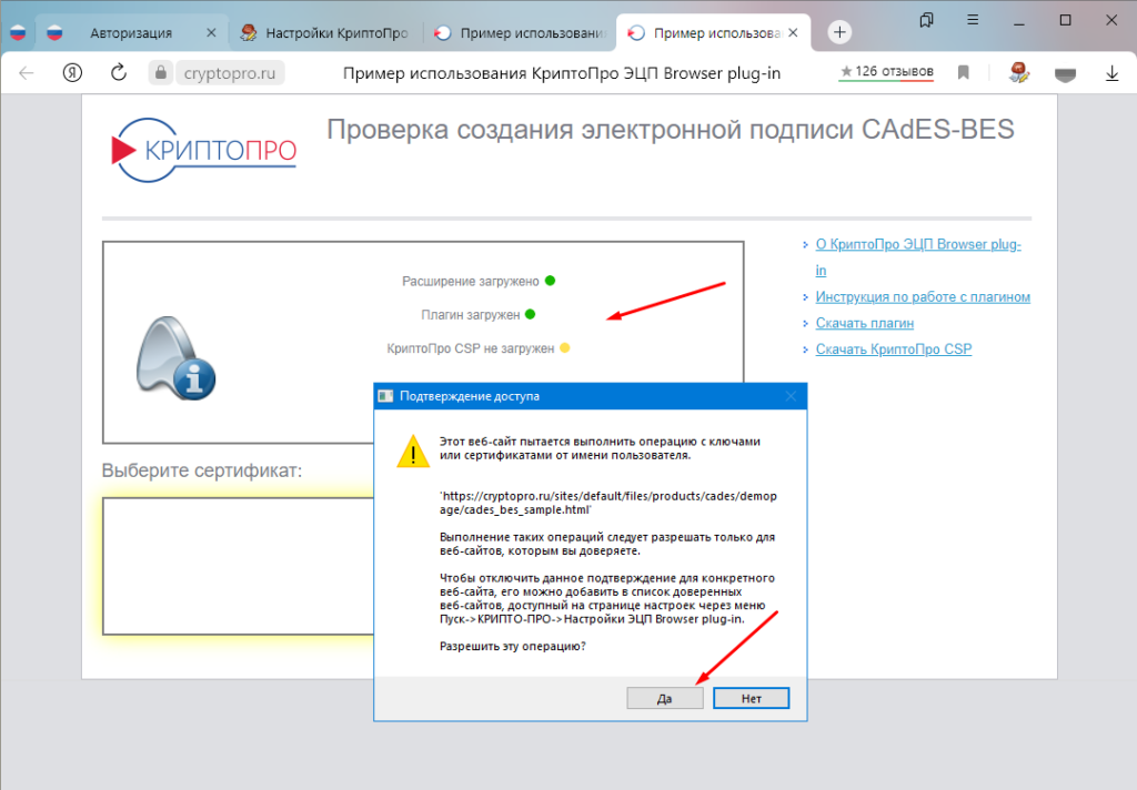 Если появляется окно «Подтверждение доступа» значит плагин и расширение работают нормально. Кстати, после нажатия «Да» в окне «Выберите сертификат» должны отобразиться все установленные сертификаты.