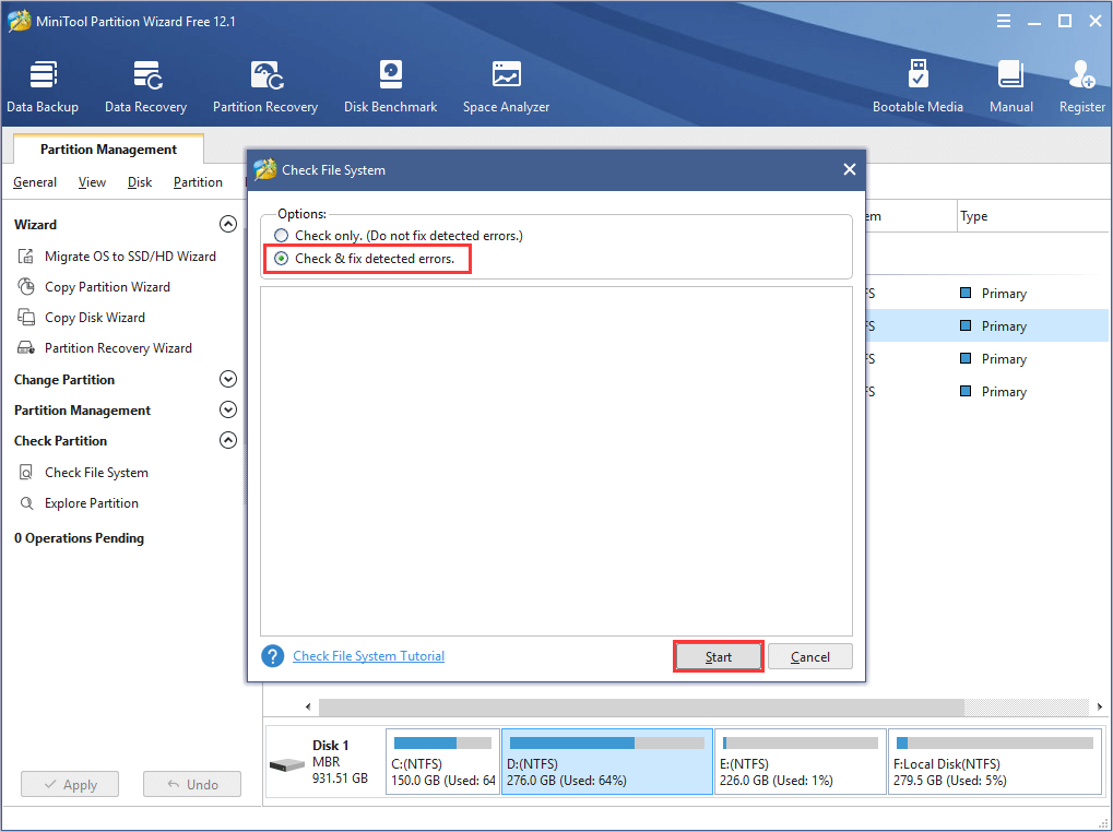 Step 3: In the pop-up window, choose Check & fix detected errors option and click Start button.