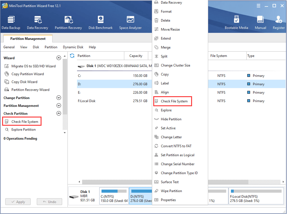 Step 2: Select the drive you want to scan for and choose Check File System feature from the left action panel. You can also activate this feature by selecting Check File System from the context menu after right-clicking the drive.