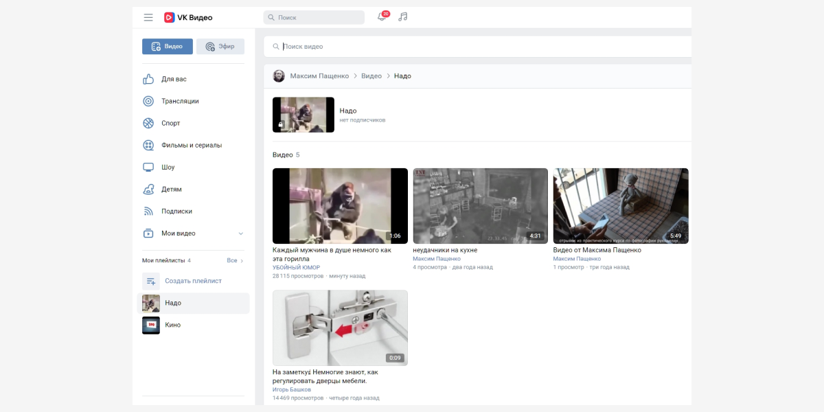 Видео пользователя также делятся на загруженные и созданные в разделе трансляции. Когда каталог с личными видео станет расширяться, их можно будет сортировать по разным параметрам.