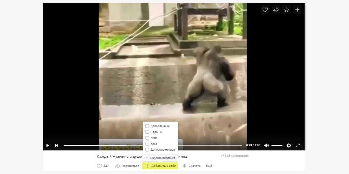 Шаг 3. Выберите ролик и кликните на просмотр. Под окном с видеороликом найдите вкладку «Добавить к себе» и отметьте нужный плейлист.