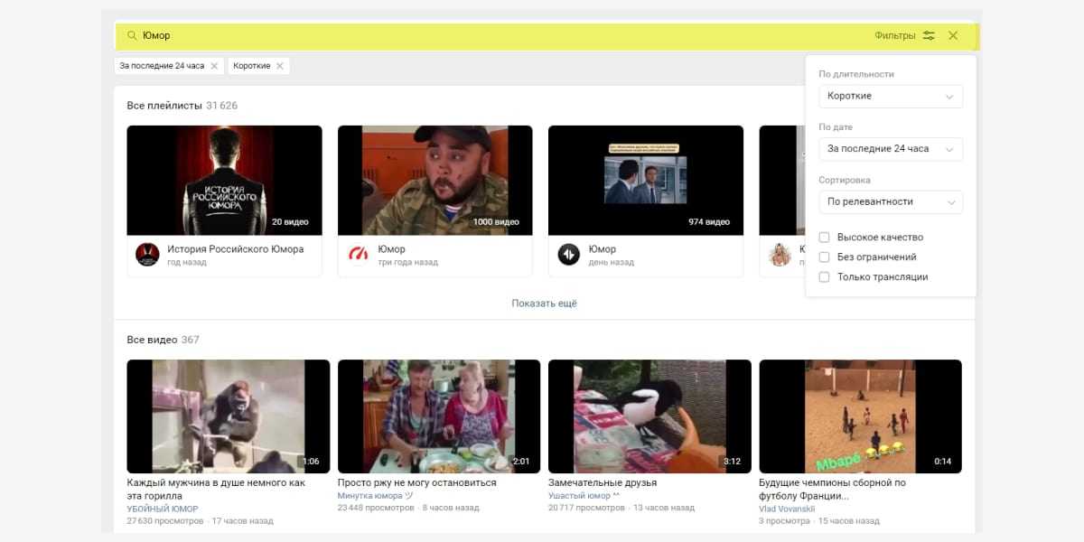В этой же строке справа можете настроить фильтры поисковой выдачи – по качеству, дате, длительности роликов