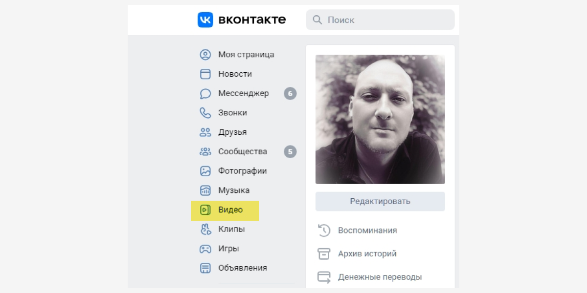 Шаг 1. Зайдите на свою страницу во ВКонтакте и выберите раздел «Видео».