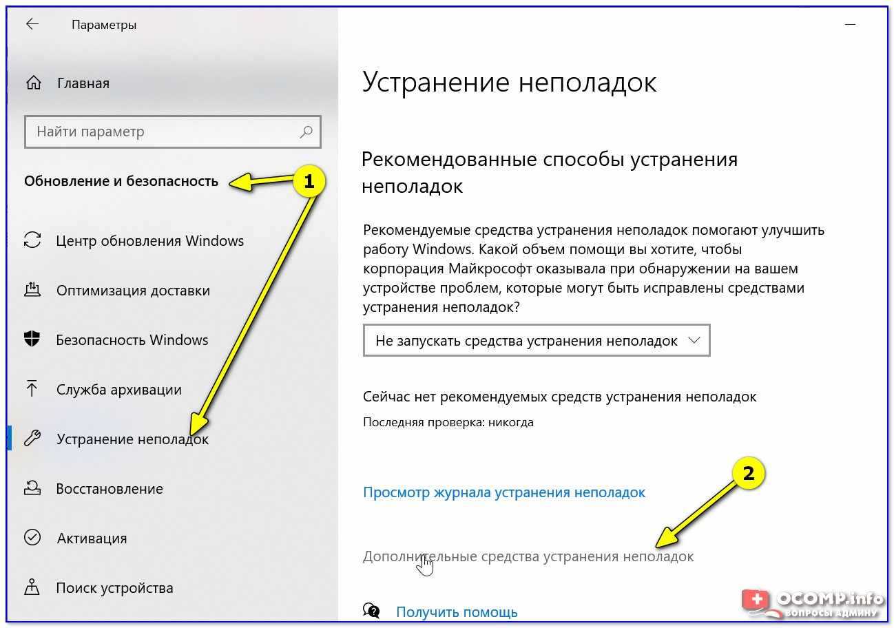 Ну и последнее… Если вы используете ОС Windows 10 — попробуйте открыть параметры системы (сочетание Win+i) и перейти во вкладку ‘Обновление и безопасность / устранение неполадок / доп. средства’ .