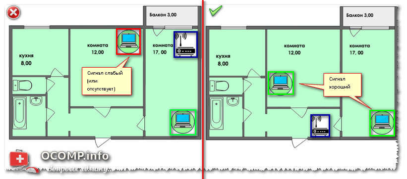 Расположение роутера в квартире: справа – вариант намного удачнее
