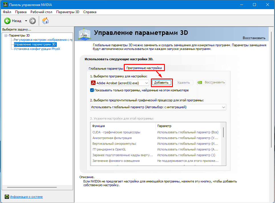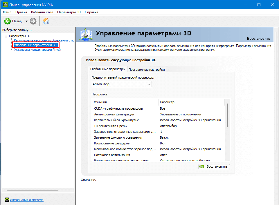 - В разделе «Управление параметрами 3D», нажать на «Программные настройки»;