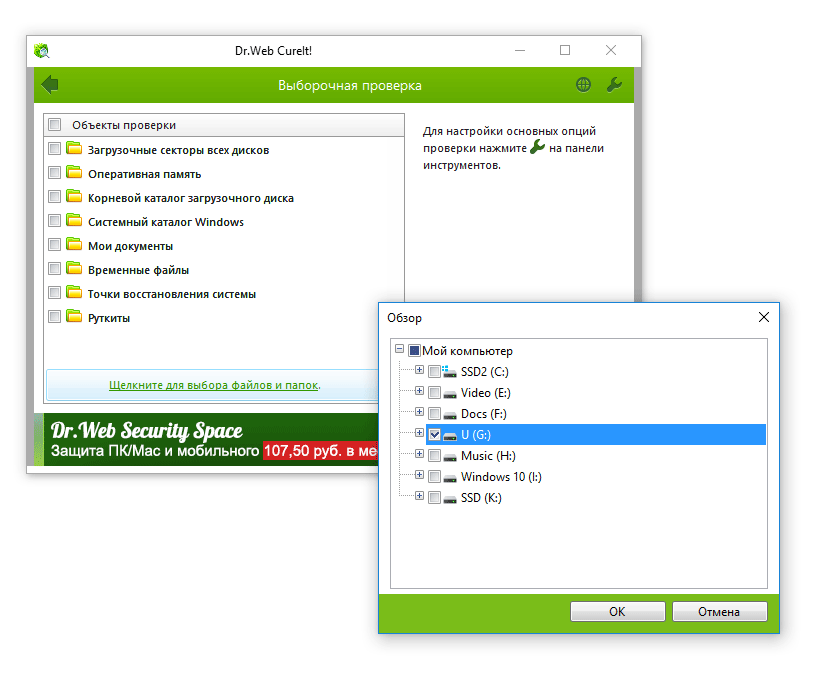 2. Нажмите кнопку «Выбрать объекты для проверки» для выбора устройства хранения