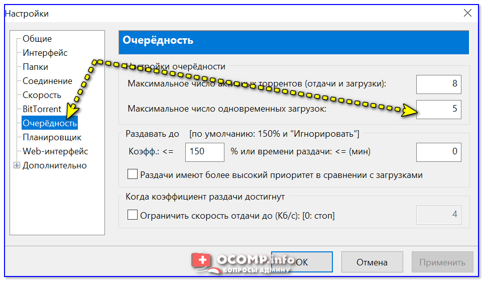 В клиенте μTorrent доступно одномоментное скачивание пяти файлов, но их количество можно увеличивать и до восьми. При этом для ускорения загрузки отдельного торрента рекомендуется приостановить все прочие загрузки, а также ограничить отдачу, что можно сделать в настройках в разделе «Очередность».
