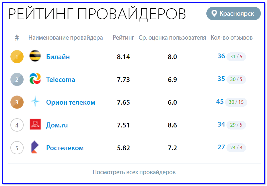 Если скорость и стабильность доступа к Интернет у вашего провайдера часто «хромает» — возможно стоит задуматься о его смене. В этом плане удобно пользоваться спец. рейтингами провайдеров (например, https://provayder.net/), где, выбрав свой город — можно просмотреть отзывы о качестве предоставляемых услуг.