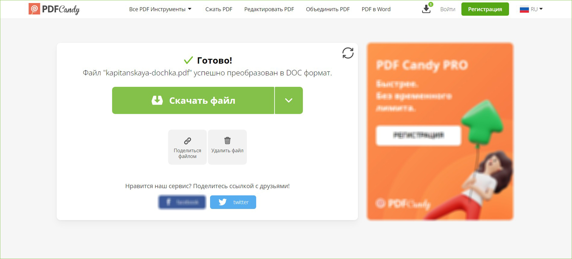 - Процесс выполняется без участия пользователя. Когда он будет завершен, скачайте итог или поделитесь ссылкой на него.