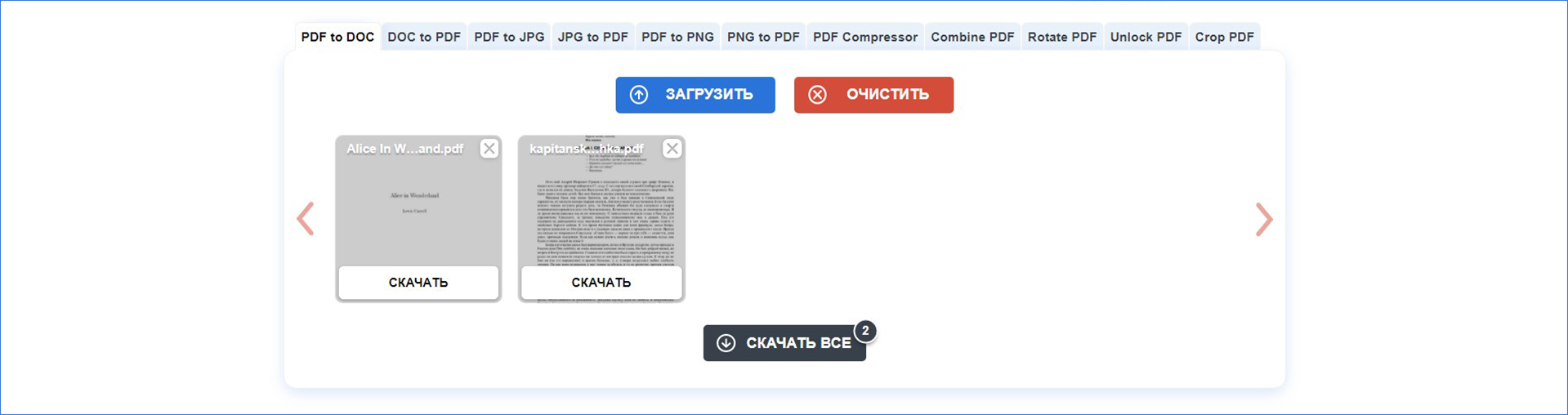 Работа с сайтом достаточно проста и интуитивно понятна: достаточно выбрать файл на своем компьютере, который вы хотите преобразовать и нажать кнопку «Конвертировать». После завершения процесса преобразования файла, начнется его автоматическая загрузка на компьютер. На протестированных файлах данный онлайн сервис показал себя достаточно хорошо — каких-либо проблем не возникло и, считаю, его можно рекомендовать. Кроме этого, интерфейс этого конвертера выполнен на русском языке. Кстати, этот онлайн конвертер позволяет преобразовывать и многие другие форматы в различных направлениях, а не только DOC, DOCX и PDF.