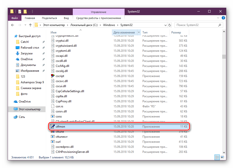Если на компьютере с Виндовс 10 вы не можете переключаться с русского на английский или наоборот, стоит проверить файл ctfmon.exe на работоспособность. Именно он отвечает за отображение языковой панели и её функционирование. Для этого стоит перейти в «диск С/Windows/System32» и найти файл «ctfmon.exe».