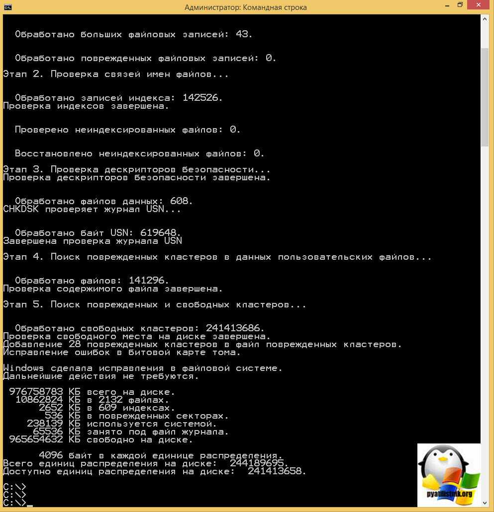 Обработано свободных кластеров: 241413686. Проверка свободного места на диске завершена.Добавление 28 поврежденных кластеров в файл поврежденных кластеров. Исправление ошибок в битовой карте тома.