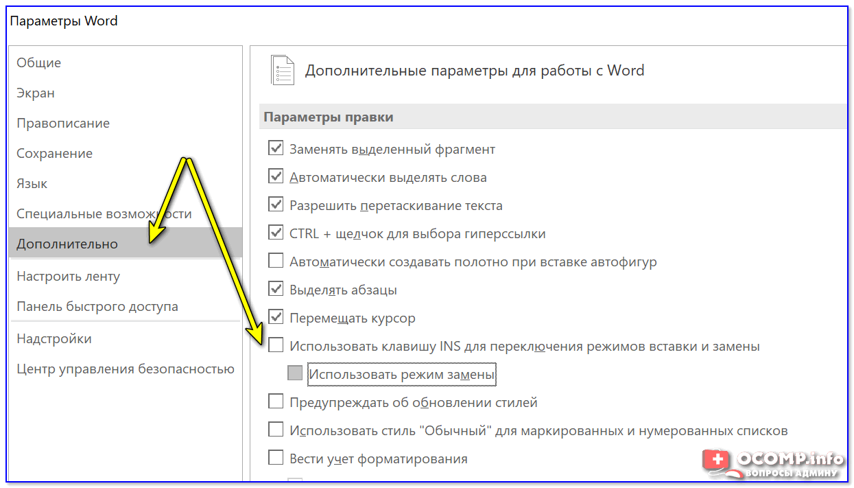 Делается это достаточно просто: сначала нужно открыть меню «Файл/параметры» , а после во вкладке «Дополнительно» снять галочку с пункта «Использовать клавишу INS для переключения режимов вставки и замена» (см. скриншот ниже 👇) .