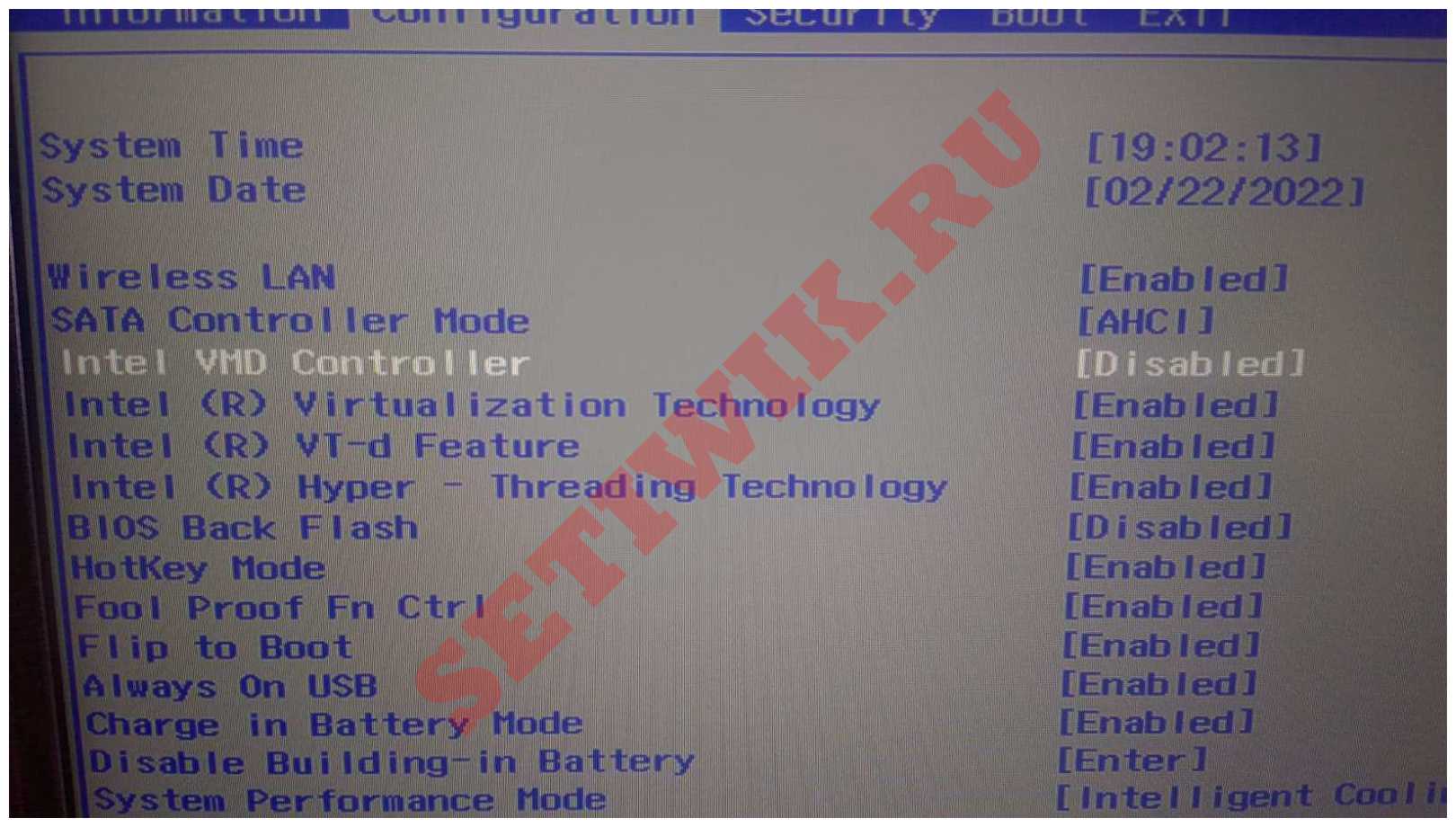 Для того чтоб отключить Intel VMD controller, перейдите на вкладку configuration и найдите функцию Intel VMD controller, нажмите Enter и вместо Enable установите Disable. Как показано на рисунке ниже.