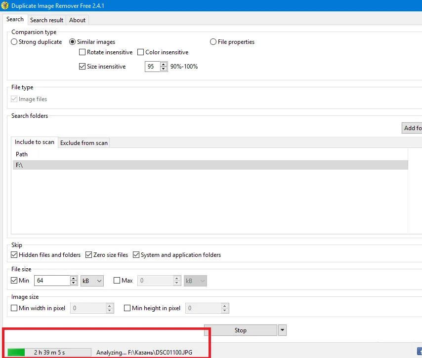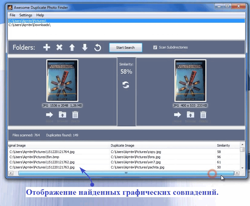 Кнопкой «Start Search» запускают процесс сканирования. Для первого раза можно просканировать 1 папку, результаты совпадений программа выдаст по окончанию этого процесса.