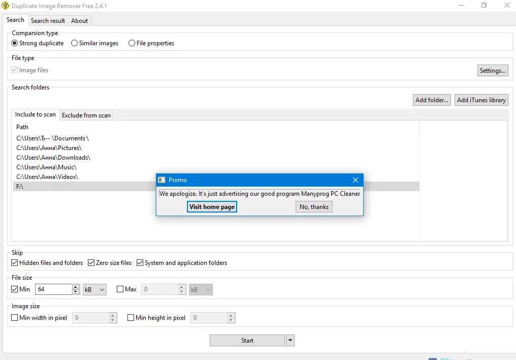 Навязчивая реклама в Duplicate Image Remover (Free)