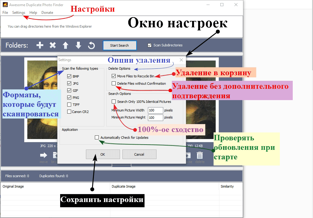 Далее в «Starch Options» есть строка «Search Only 100% Identical Pictures», активизация которой обяжет программу находить только со 100%-м сходством. Последняя опция настроек со словом «…Update» означает о необходимости поиска обновлений программы при ее старте. Итак, настроив программу, нажимают «Ок».