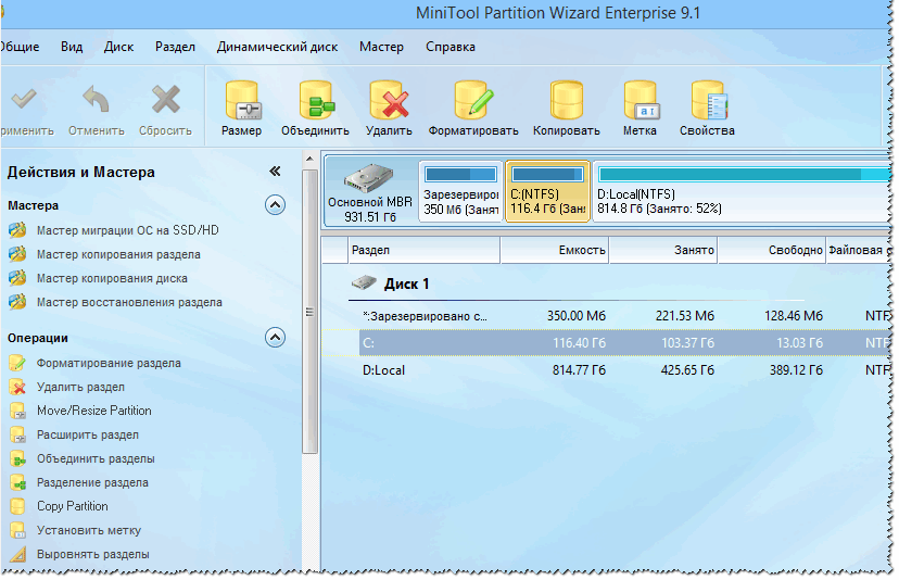 MiniTool Partition Wizard — скриншот окна (возможности программы)