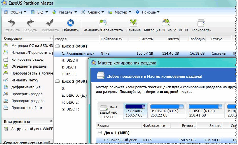 - мастер миграции Windows на другой диск/раздел (удобно, например, при переносе Windows с HDD на SSD);