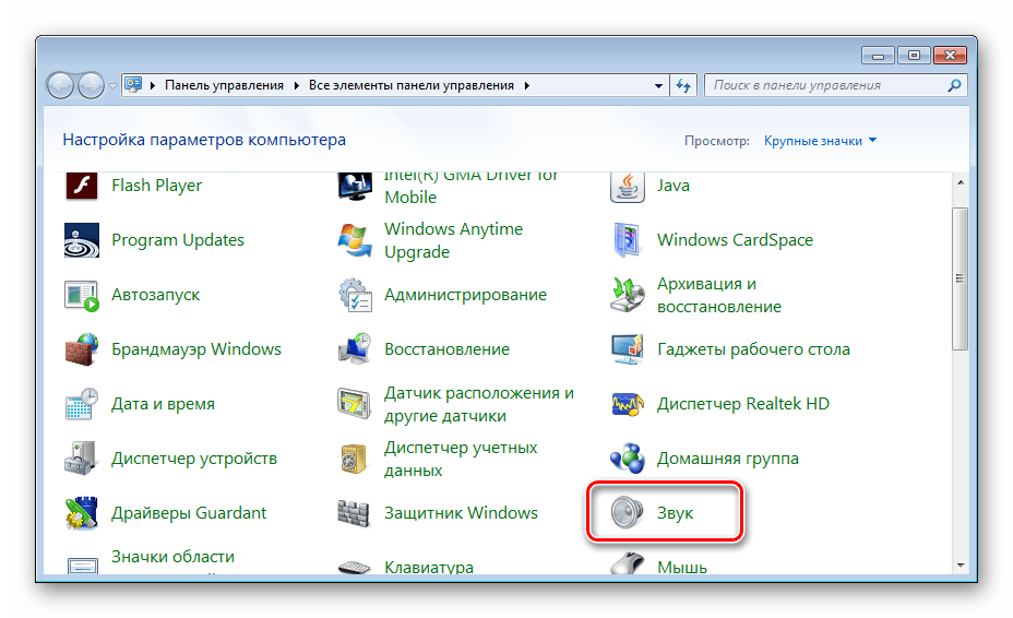 В режиме просмотра значков маленького или большого размера нажмите «Звук».