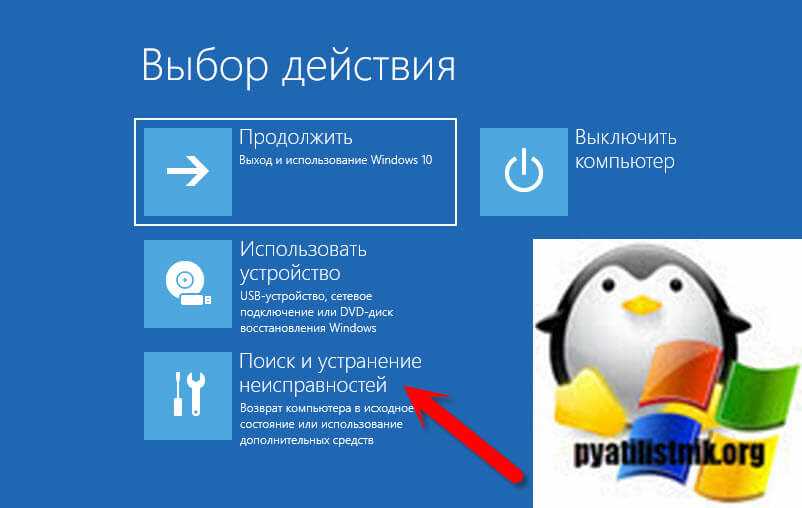 Находясь в инструментах восстановления Windows 10, выберите пункт «Поиск и устранение неисправностей»