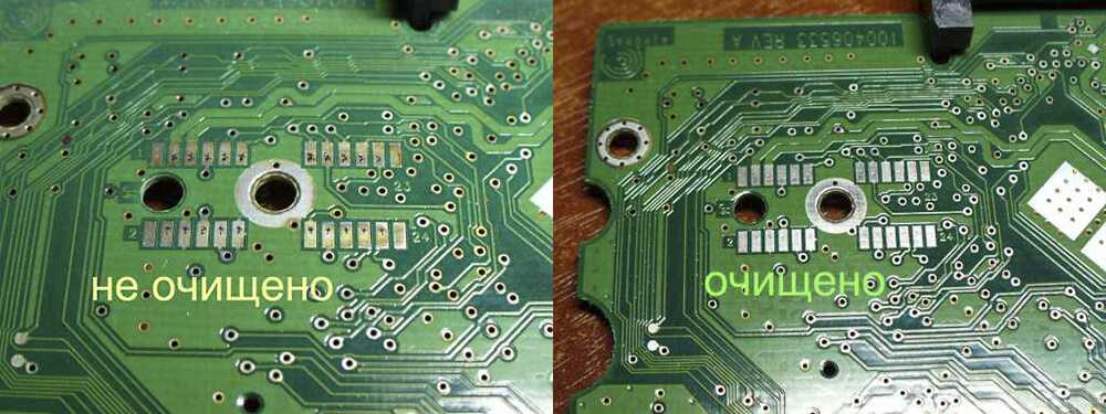 - Окись на контактах подключения или на самой плате. Для очистки контактов можно воспользоваться ластиком или ацетоном.