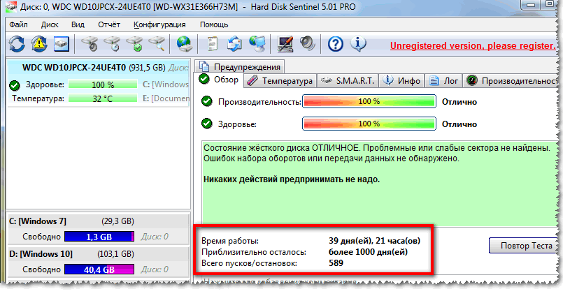 Здоровье и производительность диска оцениваются как 100% (в идеале, так и должно быть), время, которое диск еще проработает в нормальном режиме оценивается программой примерно в 1000 дней (