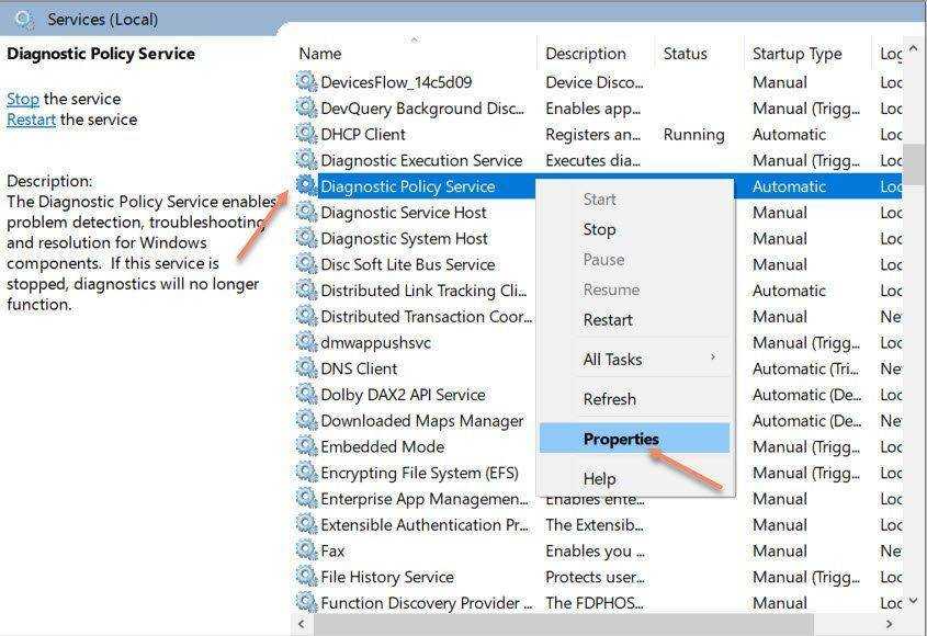 Решение 1. Проверьте службу политики диагностики в окне служб.