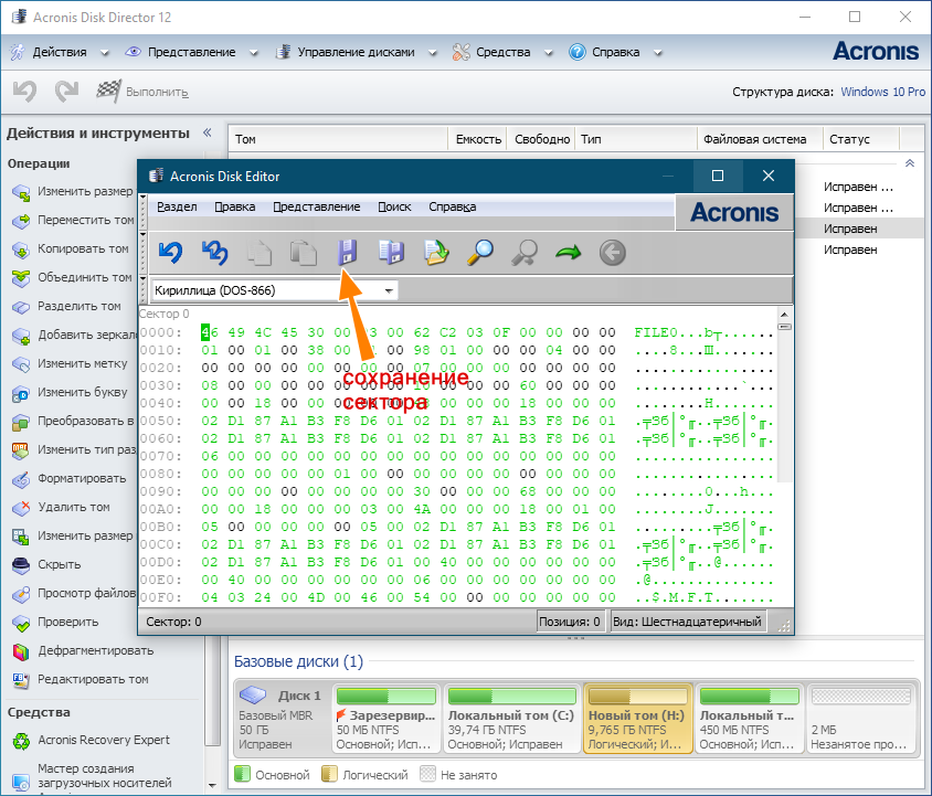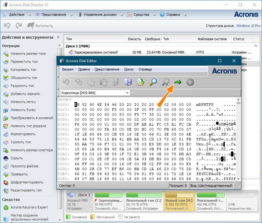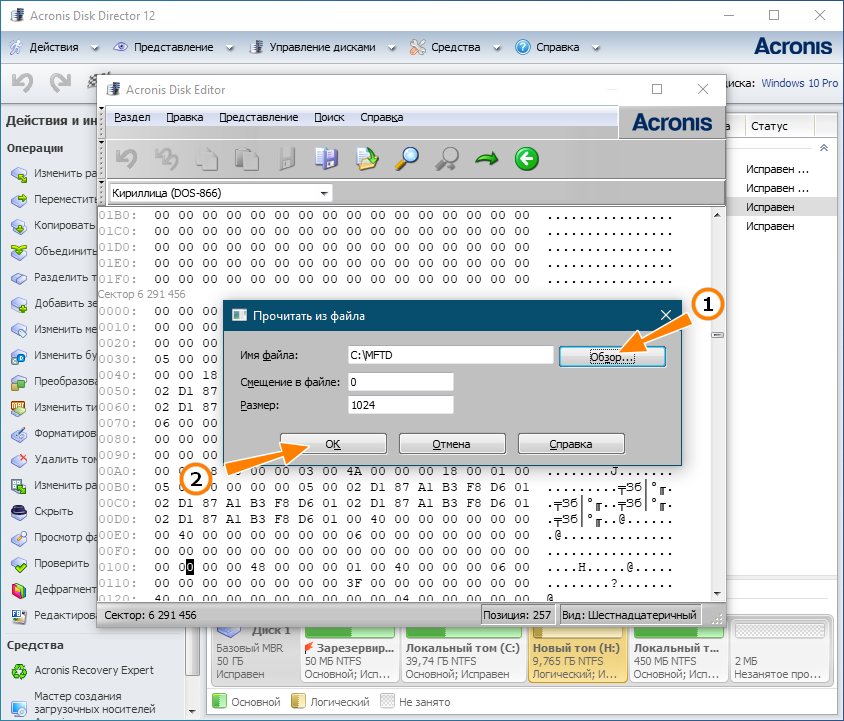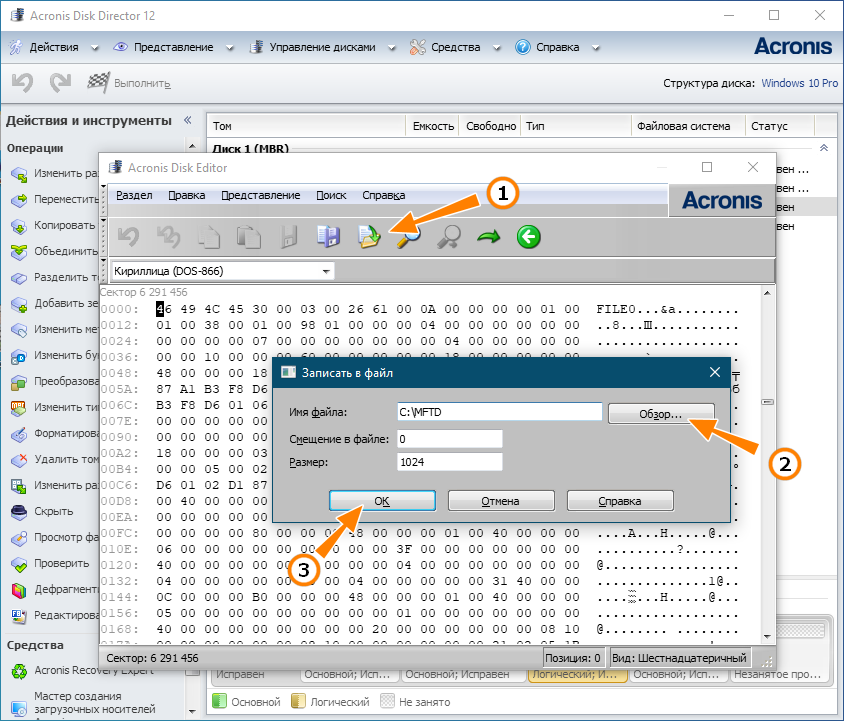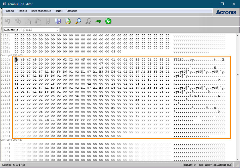 Зная же номер сектора, можно легко перейти в область MFT, воспользовавшись шестнадцатеричным редактором, например, встроенным в Acronis Disk Director 12.