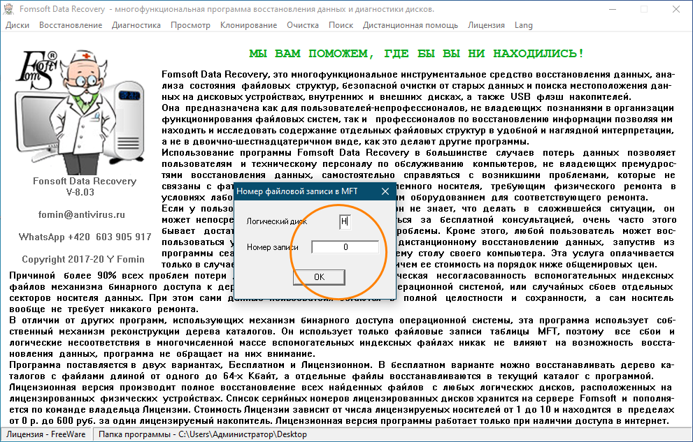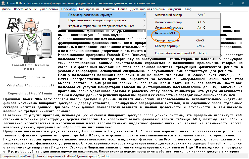 Для этих целей также можно использовать специализированную утилиту FomsoftDataRecovery, выбрав в меню «Просмотр логических структур» -> «№ Записи MFT».