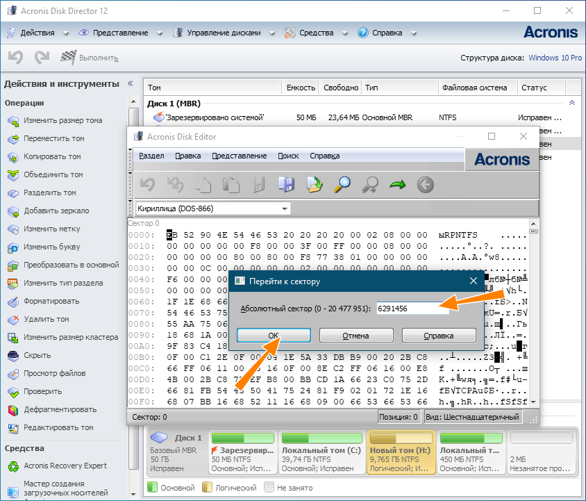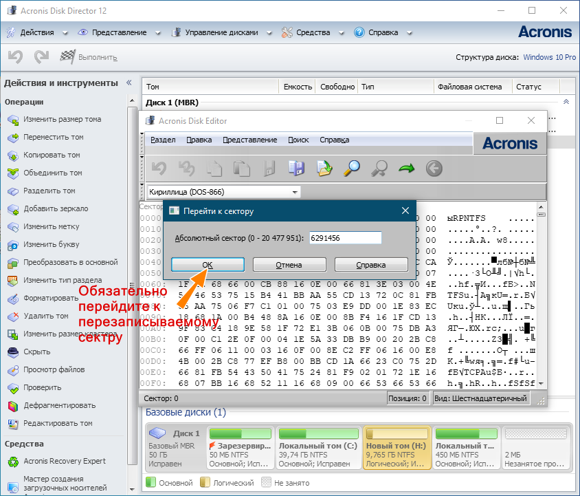 Выбираем опцию «Редактировать том», в открывшемся окошке редактора жмем стрелку «Перейти к сектору».
