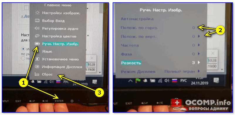 Обратите внимание на аппаратные настройки самого монитора. В большинстве моделей есть опция по смещению изображения по вертикали/горизонтали (для центровки и калибровки картинки). Кстати, чаще всего, если сбросить настройки в дефолтные или задействовать «Auto» режим (см