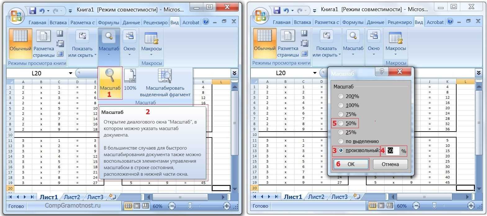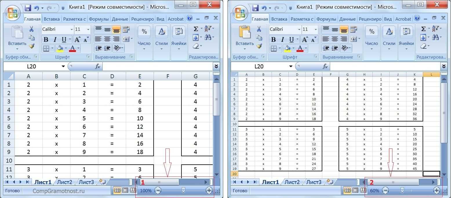 Если же теперь изменить масштаб изображения, снова используя движок в правом нижнем углу окна программы, то при достижении значения масштаба 60% (2 на рис. 11) станет видна вся таблица умножения от чисел 2, 3, 4 и 5.