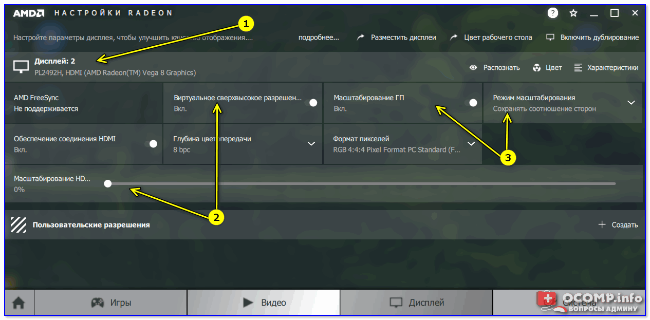 Кстати, чаще всего, если сбросить настройки в дефолтные или задействовать «Auto» режим (см. стрелка 3 на фото ниже) — изображение станет корректным, наиболее оптимальным для данной модели устройства.