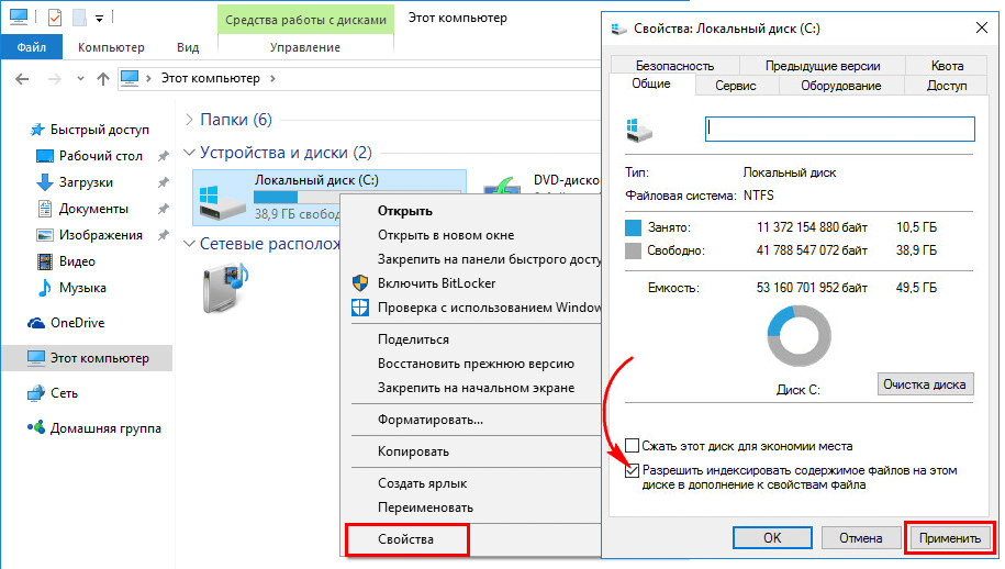 Отключение индексации диска С