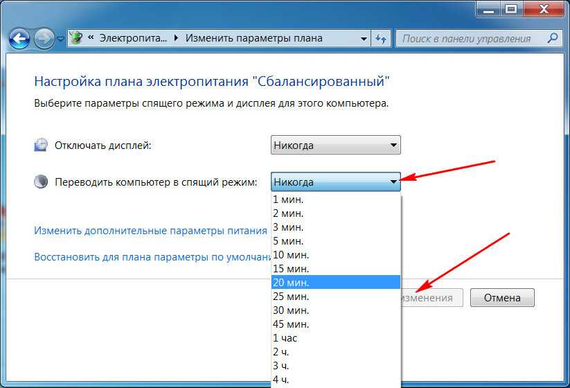 Установить время бездействия, по истечении которого Windows будет погружаться в сон, и нажать «Сохранить изменения».