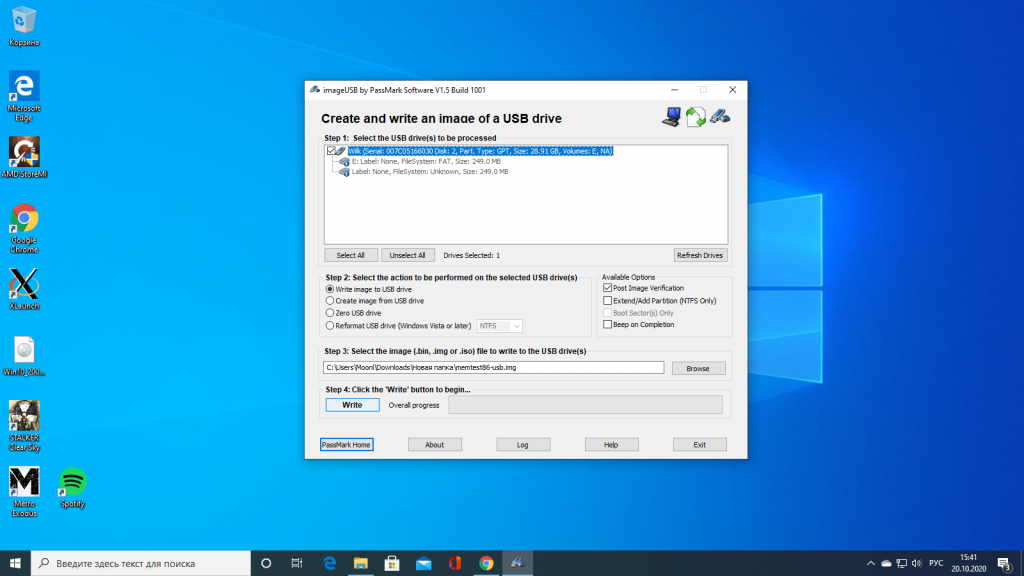 Здесь надо отметить галочкой флешку, на которую вы хотите записать Memtest86, а затем, если утилита автоматически не определила образ Memtest, выберите его в поле Step 3. Образ находится в той же папке, что и утилита, и называется memtest86-usb.img. После этого нажмите кнопку Write и дождитесь завершения записи. После завершения записи программу можно закрыть, а компьютер необходимо перезапустить.